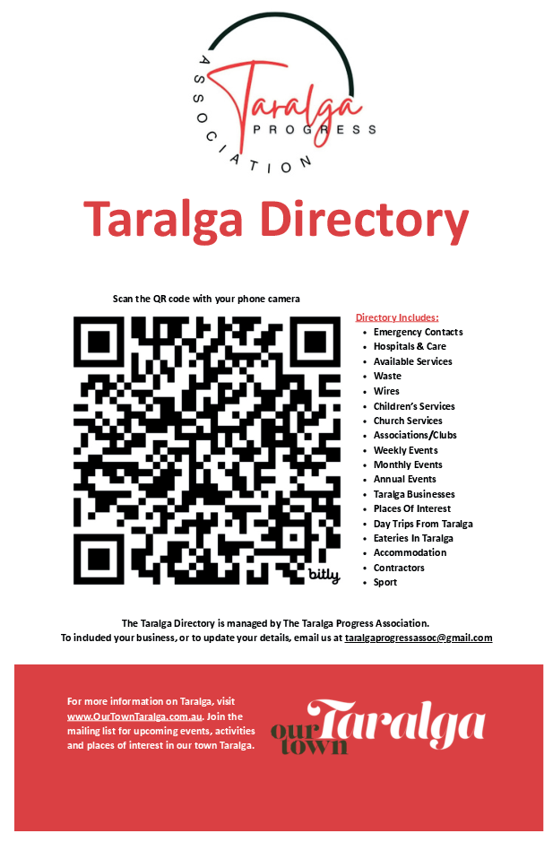 For many years the Taralga Progress Association (TPA) has produced a directory of services for new residents and visitors to Taralga as a hard copy. Now, the TPA have made an updated version which can be accessed online via this site or directly via a QR code for your phone.